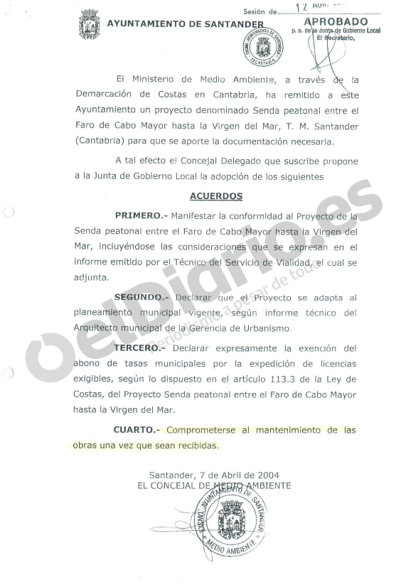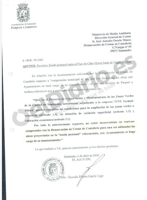 Un acuerdo de 2004, aprobado por la Junta de Gobierno Local, muestra que el Ayuntamiento de Santander se comprometió a hacerse cargo del mantenimiento de la senda costera entre el Faro de Cabo Mayor y la Virgen del Mar “una vez que las obras sean recibidas” por el Consistorio. El texto, firmado por el entonces alcalde Gonzalo Piñeiro y el concejal de Medio Ambiente Íñigo de la Serna, recoge además que el proyecto se adapta al planeamiento municipal y que no se oponía a asumir esas responsabilidades, porque el contrato de mantenimiento de zonas verdes ya contemplaba la posibilidad de ampliar los espacios a conservar. La información ha sido publicada, al igual que el documento, eldiario.es Cantabria.
