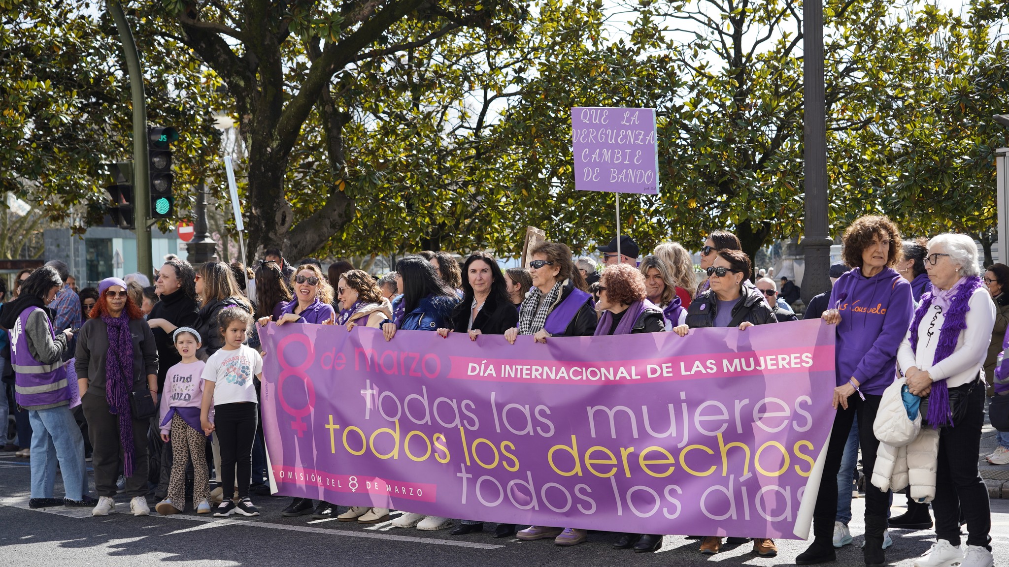 El desfile ha estado encabezado por una gran pancarta con el lema «Todas las mujeres. Todos los derechos. Todos los días». Entre los participantes, se han visto representantes de las Asambleas Feministas de Cantabria, colectivos como Alega o la Plataforma Abolicionista, sindicatos como CCOO y UGT, el Sindicato de Estudiantes, y también autoridades como la consejera de Inclusión Social, Begoña Gómez del Río, el expresidente Miguel Ángel Revilla (PRC) o diputados de PP, PRC y PSOE.