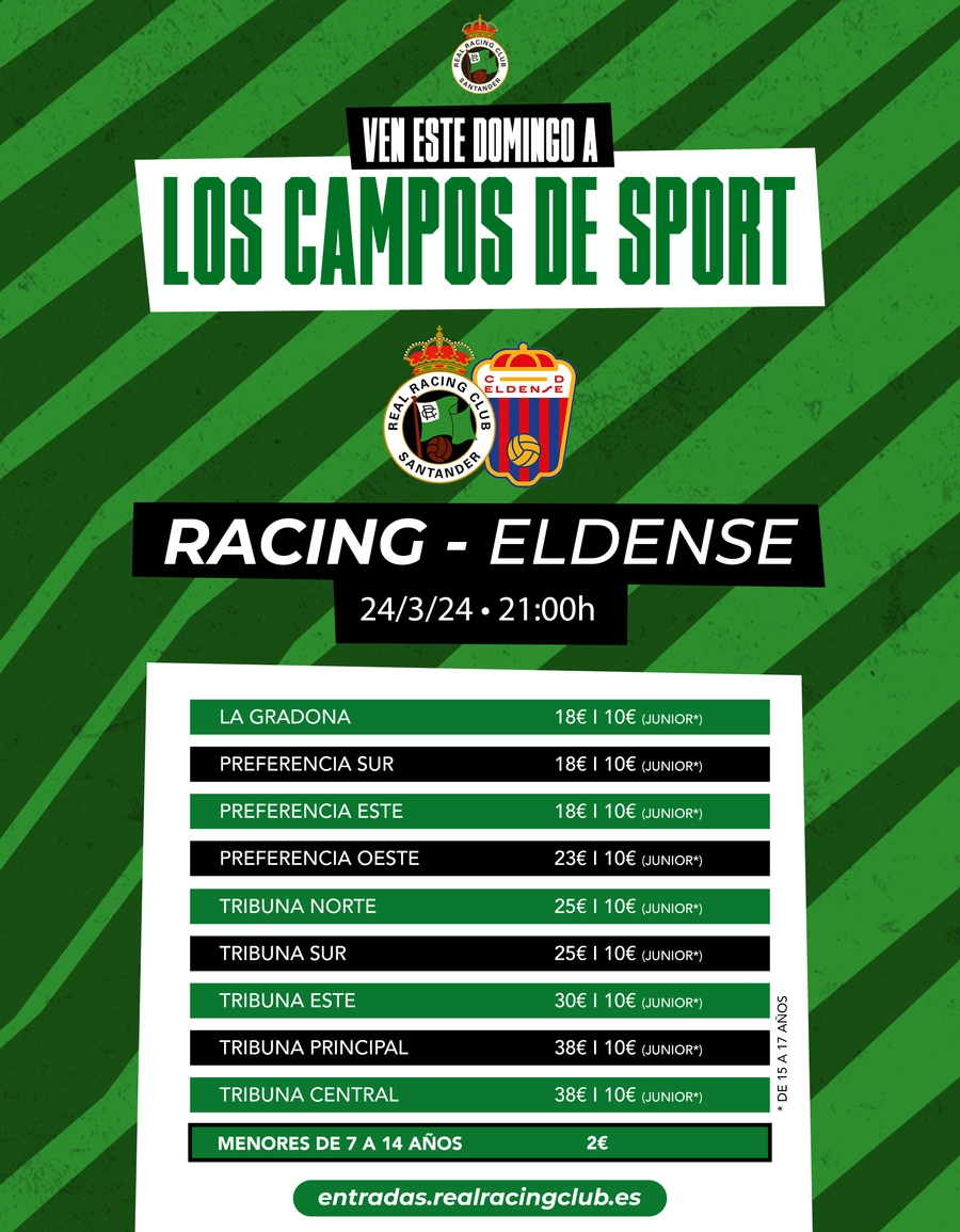 Las entradas para el partido entre el Racing y el Club Deportivo Eldense están disponibles online y en las taquillas de Los Campos de Sport, que permanecerán abiertas hasta el viernes 22 de 10:00 a 20:00. El sábado 23 su horario será de 10:00 a 14:00 y el domingo día 24 se atenderá al público a partir de las 12:00.
