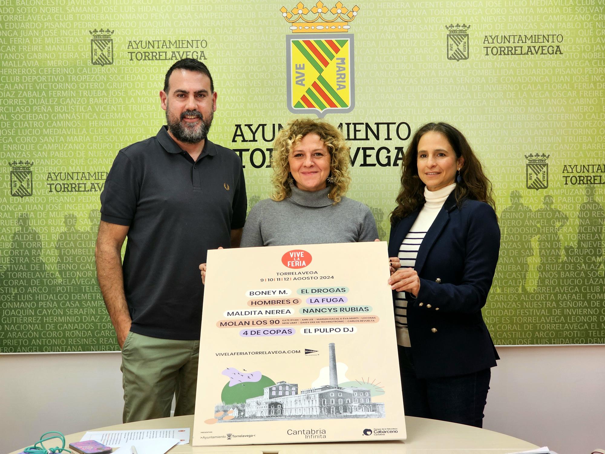 La concejala de Festejos, Patricia Portilla, acompañada por la coordinadora del Servicio de Información Turística y Publicaciones de la empresa pública CANTUR, Carolina Gómez; y por el director del festival y gerente de MG Producciones, Manuel Gutiérrez ha presentado el cartel de la V edición de ‘Vive la Feria’ que se celebrará en el exterior del recinto ferial de La Lechera del 9 al 12 de agosto.
