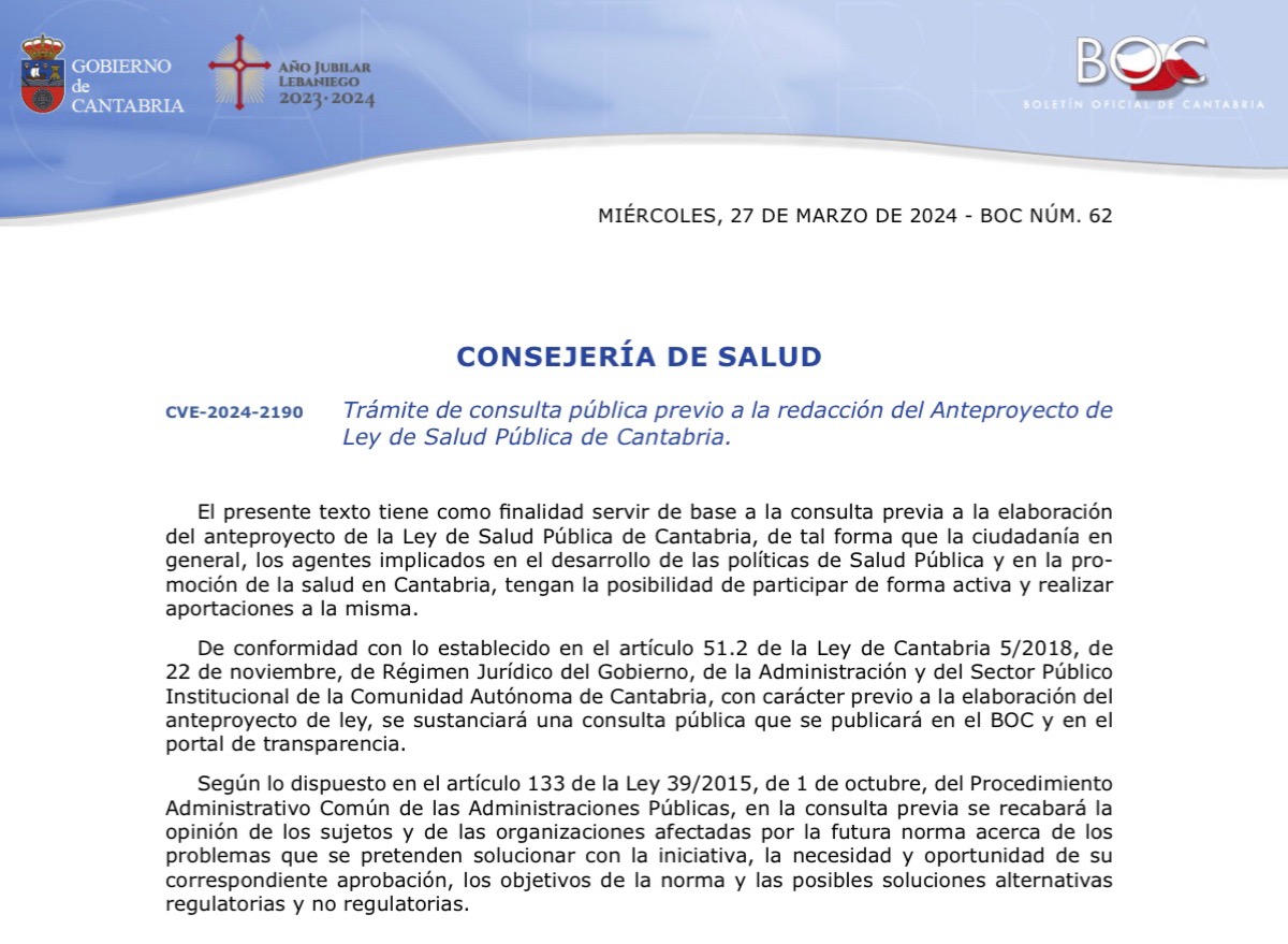 Así, tras la publicación de la Resolución en el Boletín Oficial de Cantabria (BOC) se abre la fase de consulta previa a la elaboración del anteproyecto de la Ley de Salud Pública de Cantabria. De este modo, la ciudadanía y los agentes implicados en el desarrollo de las políticas de Salud Pública y en la promoción de la salud en Cantabria tienen la posibilidad de participar de forma activa y realizar aportaciones a la misma.
