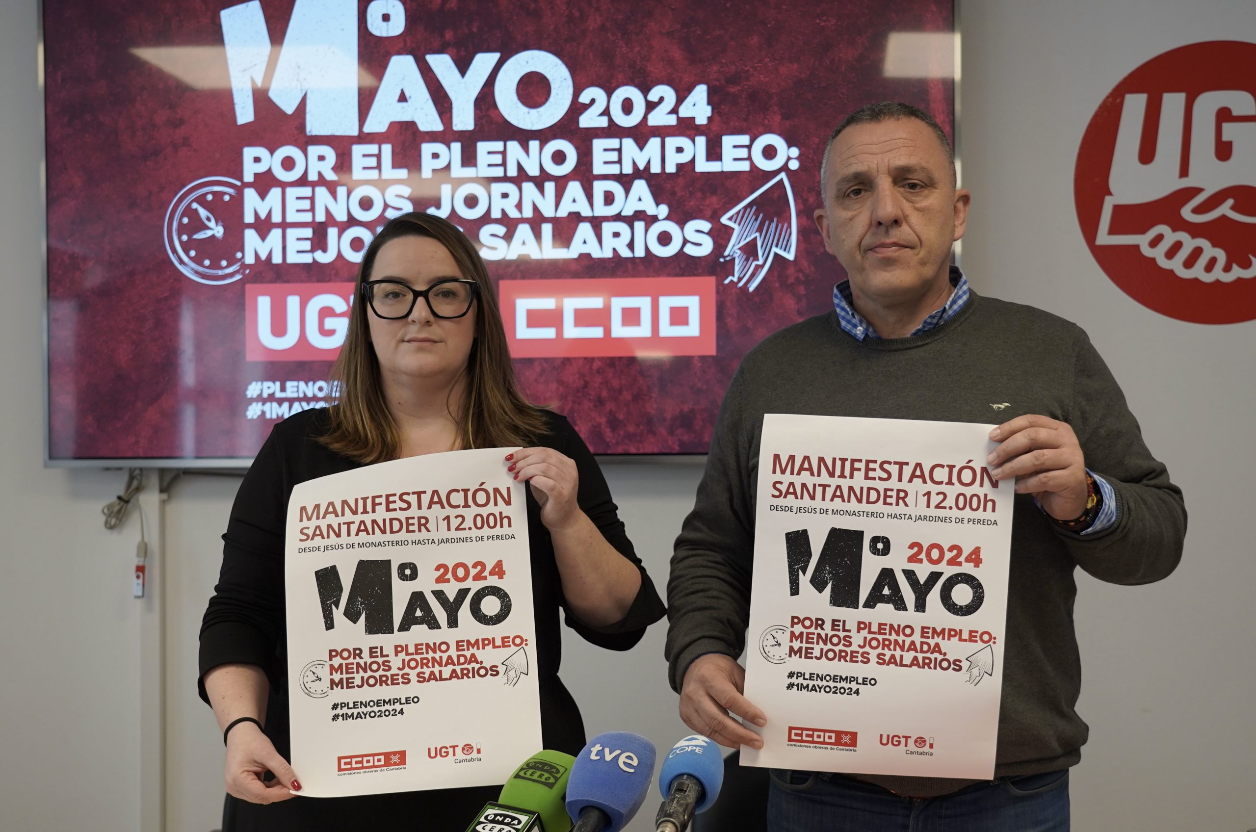 Los secretarios generales de UGT y de CCOO en Cantabria, Mariano Carmona y Rosa Mantecón, destacaron hoy en una rueda de prensa las principales reivindicaciones de ambos sindicatos en este 1 de Mayo que coincide con un período de crecimiento económico, del empleo y de los márgenes de beneficios empresariales “con cifras récord en lo referente al empleo indefinido tras dos años de vigencia de la actual reforma laboral”.