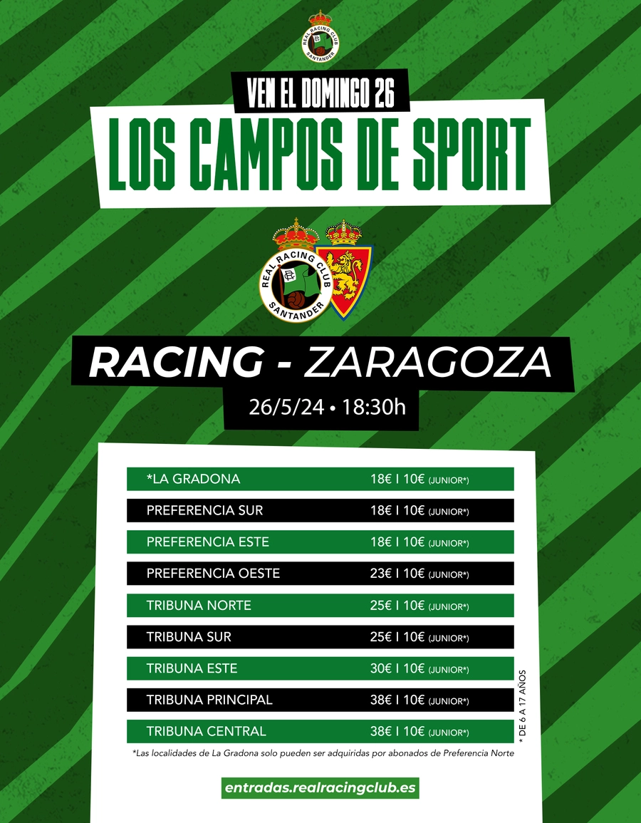 Las entradas para el partido de LaLiga Hypermotion que Racing y Real Zaragoza disputarán en Los Campos de Sport (domingo 26- 18:30 horas) estarán disponibles online y en las taquillas del estadio a partir de las 10:00 de mañana miércoles día 15. Los aficionados interesados en presenciar el encuentro entre cántabros y aragoneses pueden adquirir localidades de adulto desde 18 euros y destinadas a seguidores menores de 18 años por solo 10.