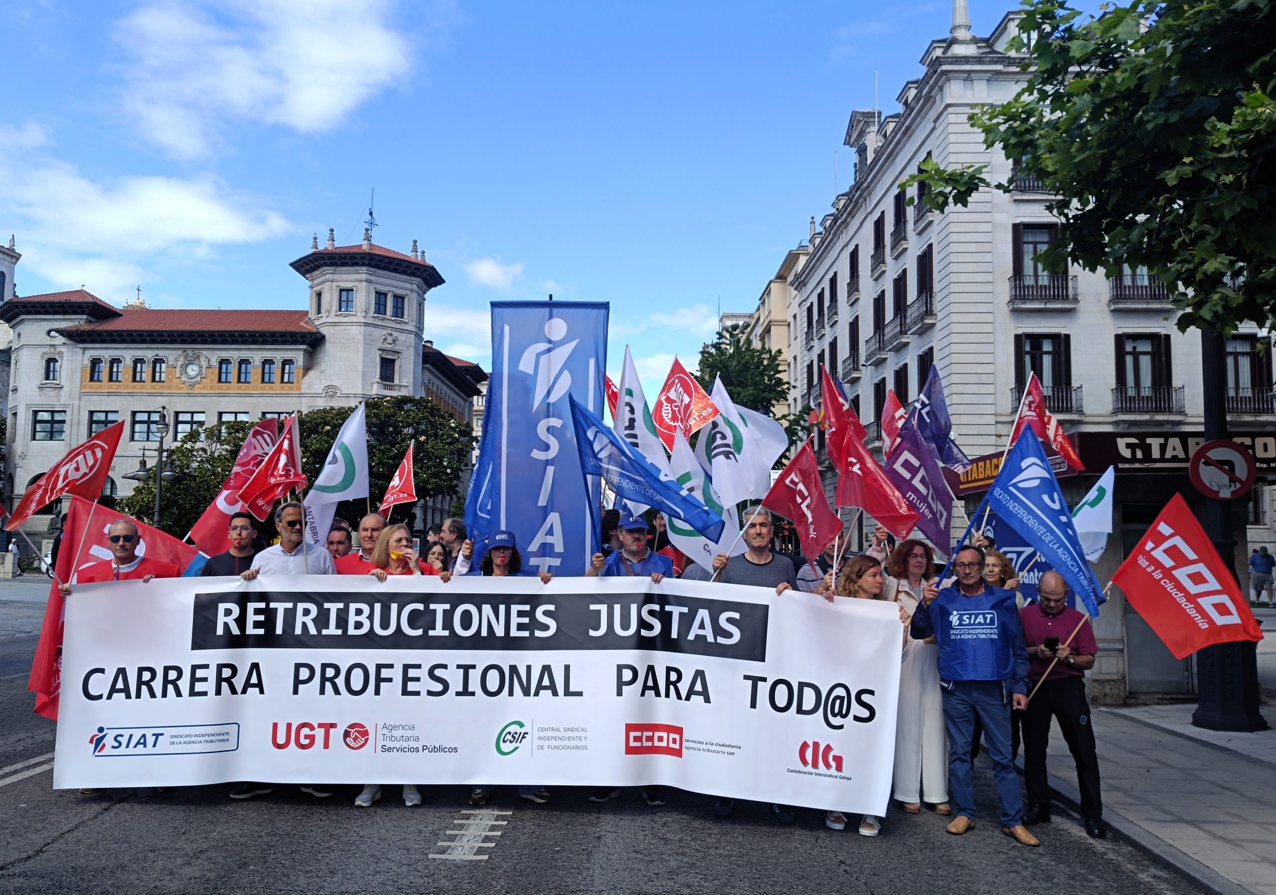 La plantilla de la Agencia Tributaria (AEAT) en Cantabria, compuesta por casi 300 personas, se ha sumado hoy a las movilizaciones convocadas por todo el territorio nacional y ha protagonizado una concentración en las puertas de la delegación especial de la calle Calvo Sotelo de Santander para hacer públicas sus reivindicaciones ante el bloqueo y la paralización total de la negociación colectiva por parte de la dirección de la empresa.