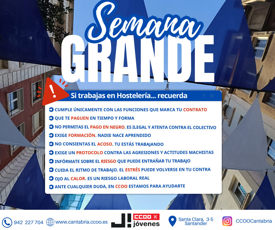 La Federación de Servicios de Comisiones Obreras en Cantabria (CCOO) ha instado hoy a las empresas de hostelería de la capital cántabra a valorar el sacrificio y el sobresfuerzo laboral que supone para los y las trabajadoras del sector atender la Semana Grande, que vivirá mañana viernes, 19 de julio, su pistoletazo de salida, y las ha animado a gratificar a las plantillas que trabajarán de manera intensa y sometidos a altos niveles de tensión y estrés durante más de una semana.