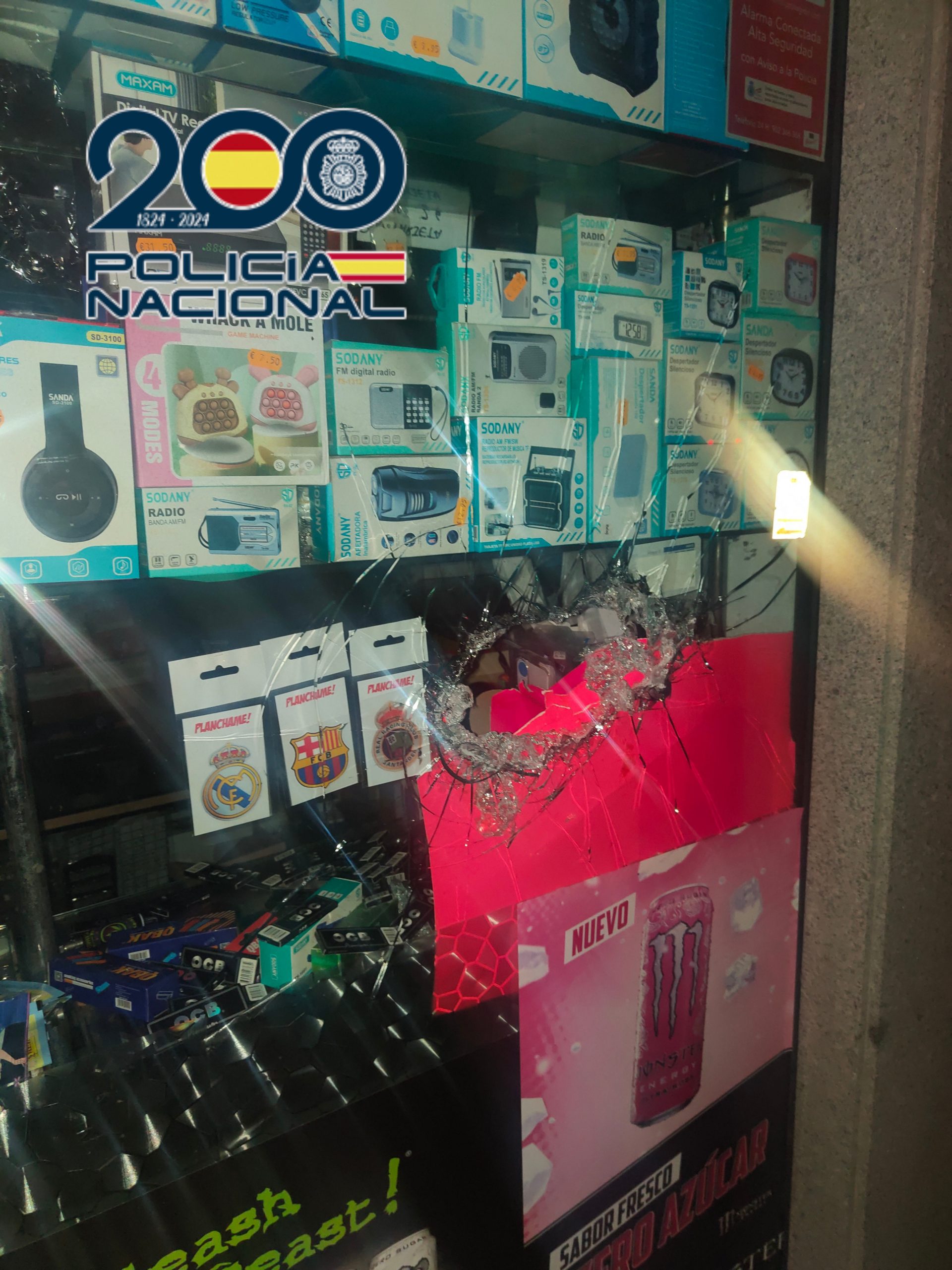 Seguidamente, otros agentes del Grupo de Atención al Ciudadano (G.A.C), pudieron comprobar como la luna del escaparate del establecimiento comercial en el que se había perpetrado el robo se encontraba fracturada, y que parte de los objetos sustraídos se encontraban desperdigados por la acera. Además, los policías pudieron localizar en las inmediaciones del establecimiento, el tornillo metálico de enganche con el que posiblemente hubieran podido fracturar el escaparate del establecimiento comercial.