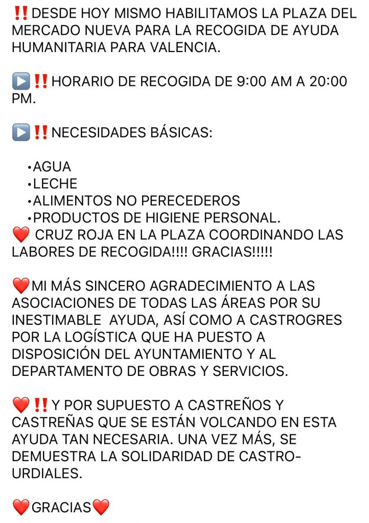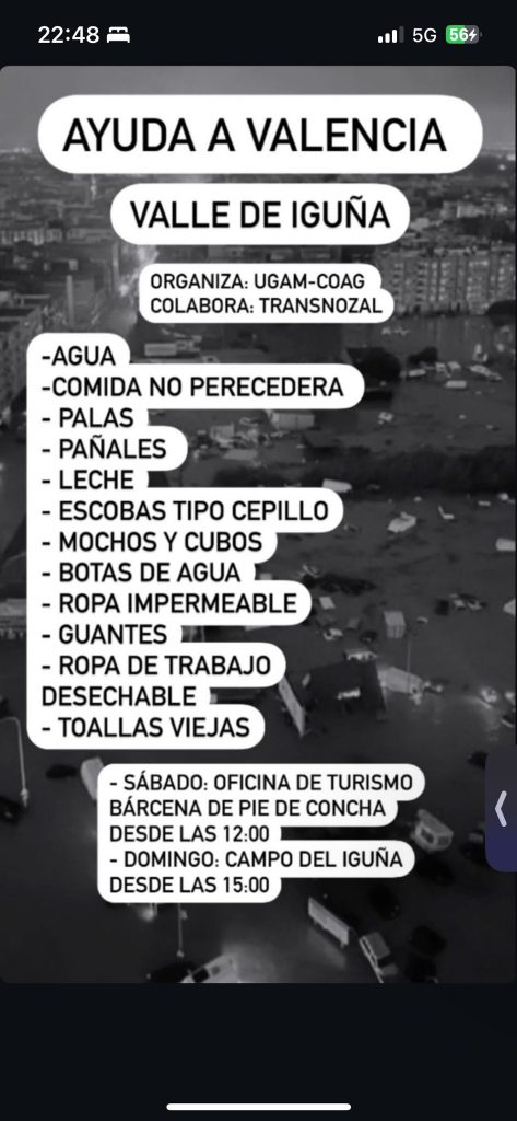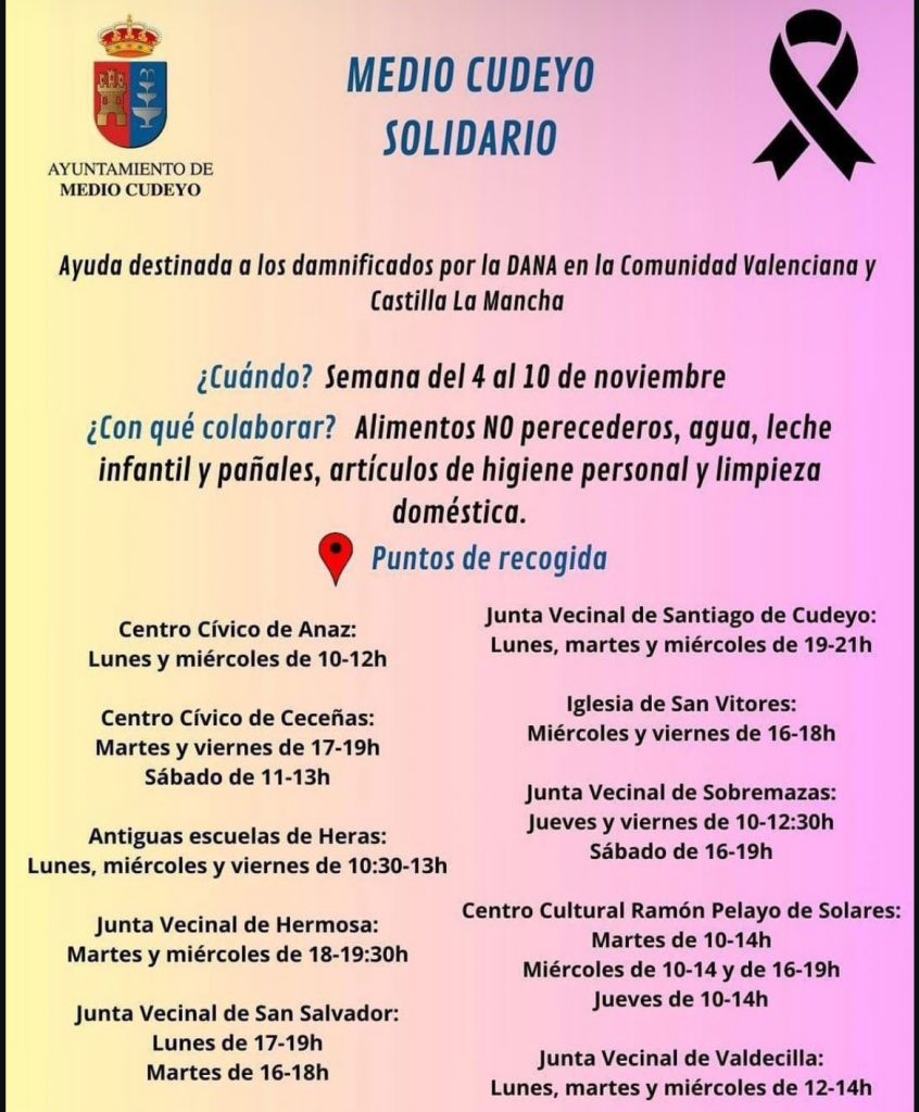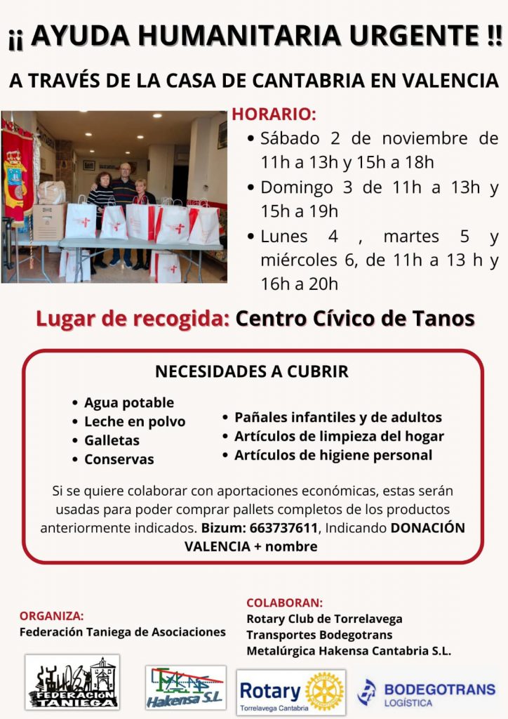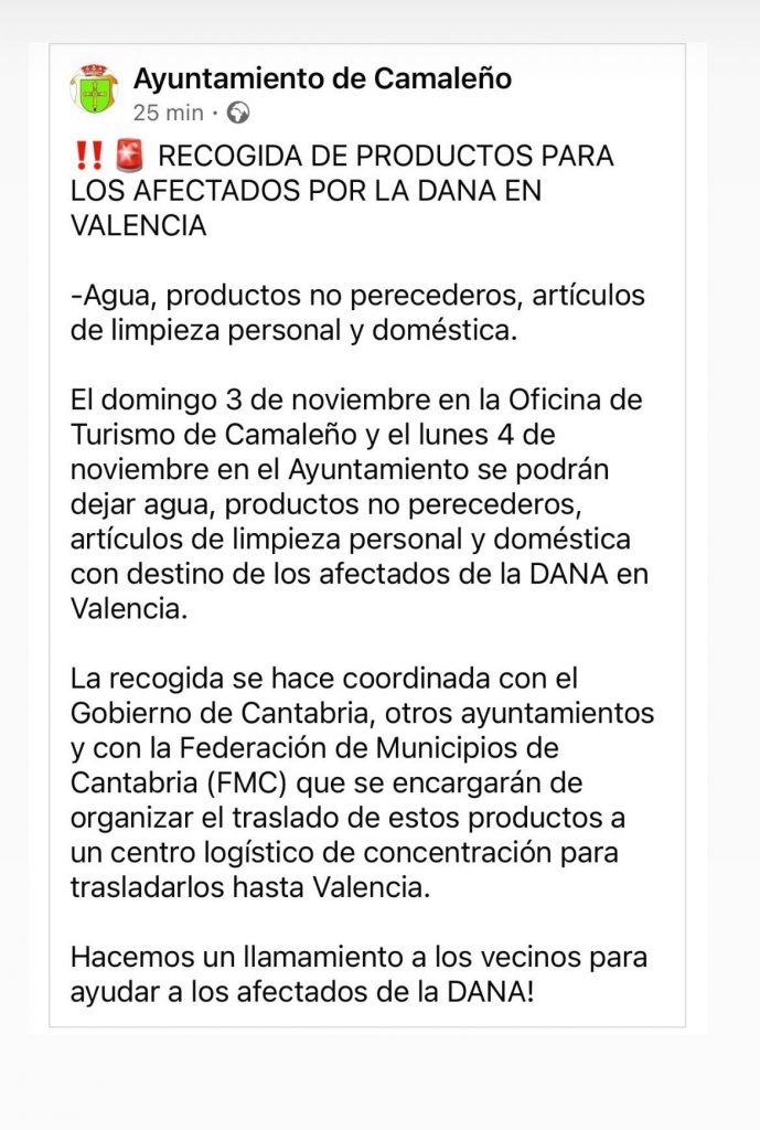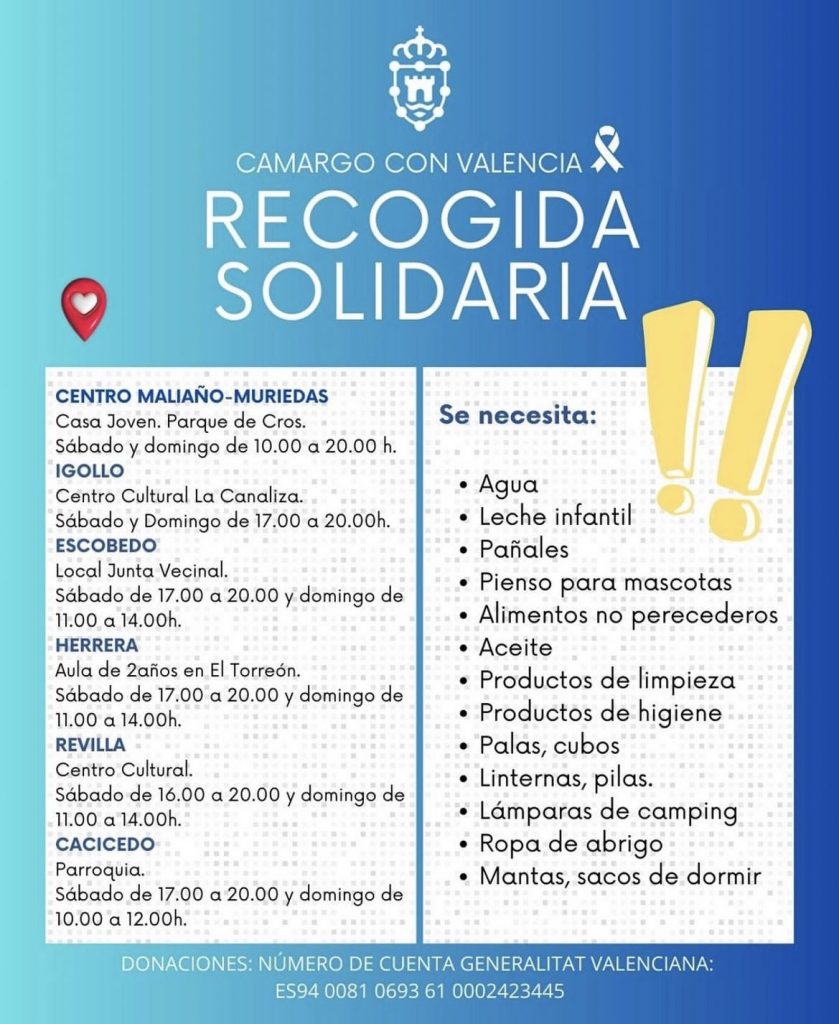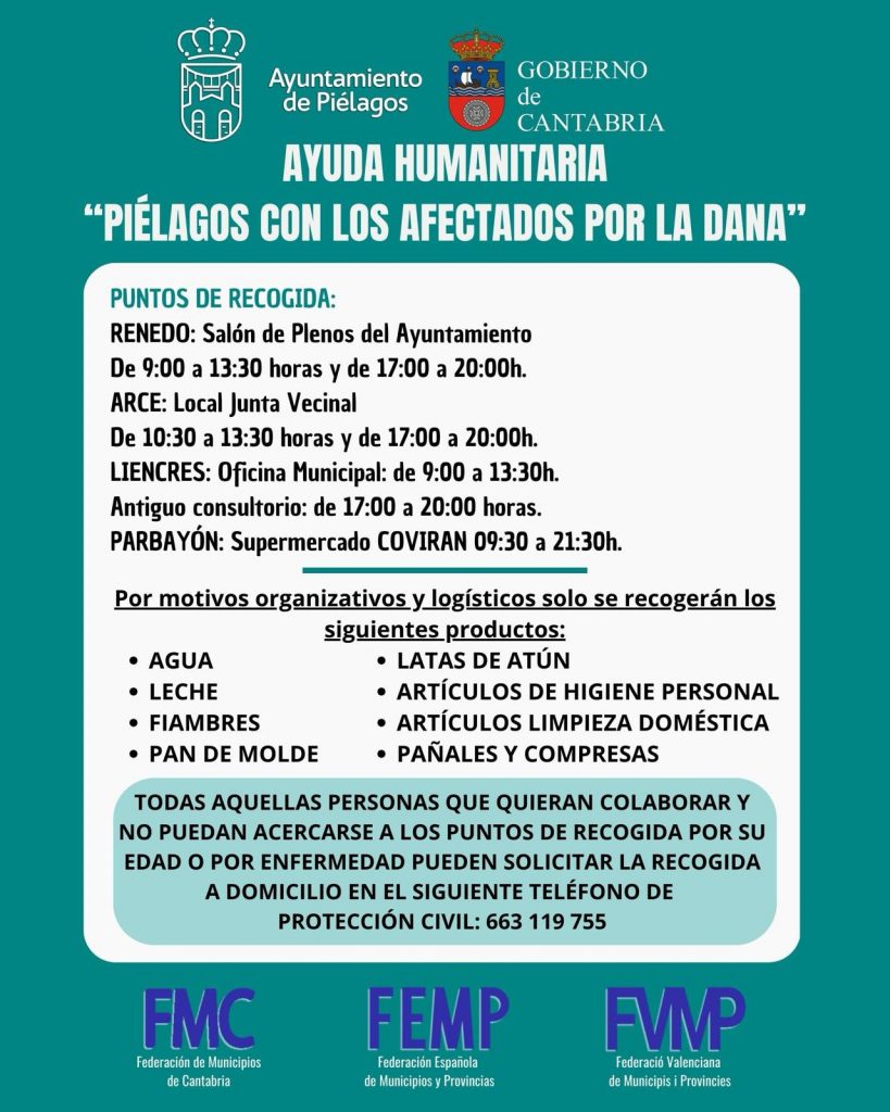 Se están recolectando en toda Cantabria productos esenciales para los afectados por la DANA en Valencia, incluyendo agua embotellada, leche, conservas, productos de higiene y alimentos precocinados. La ciudadanía puede contribuir en distintos puntos de recogida habilitados por municipios, organizaciones y entidades locales, tanto públicas como privadas. Cantabria está impulsando múltiples campañas para canalizar esta ayuda de manera efectiva.