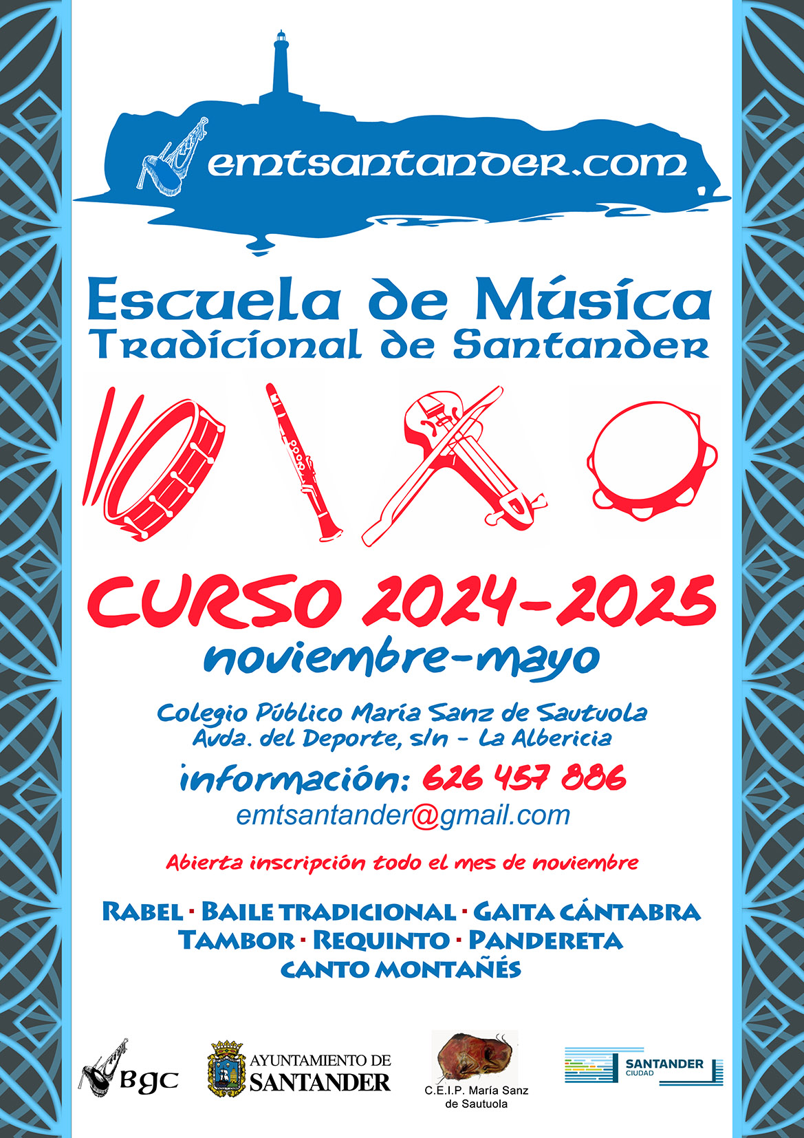 Las personas interesadas en participar podrán ampliar información o formalizar su inscripción en el Colegio Público María Sanz de Sautuola, ubicado en la Avenida del Deporte, -sede habitual de la escuela-, y tienen a su disposición también la web www.emtsantander.com, el teléfono 626 457 886 o el correo emtsantander@gmail.com.