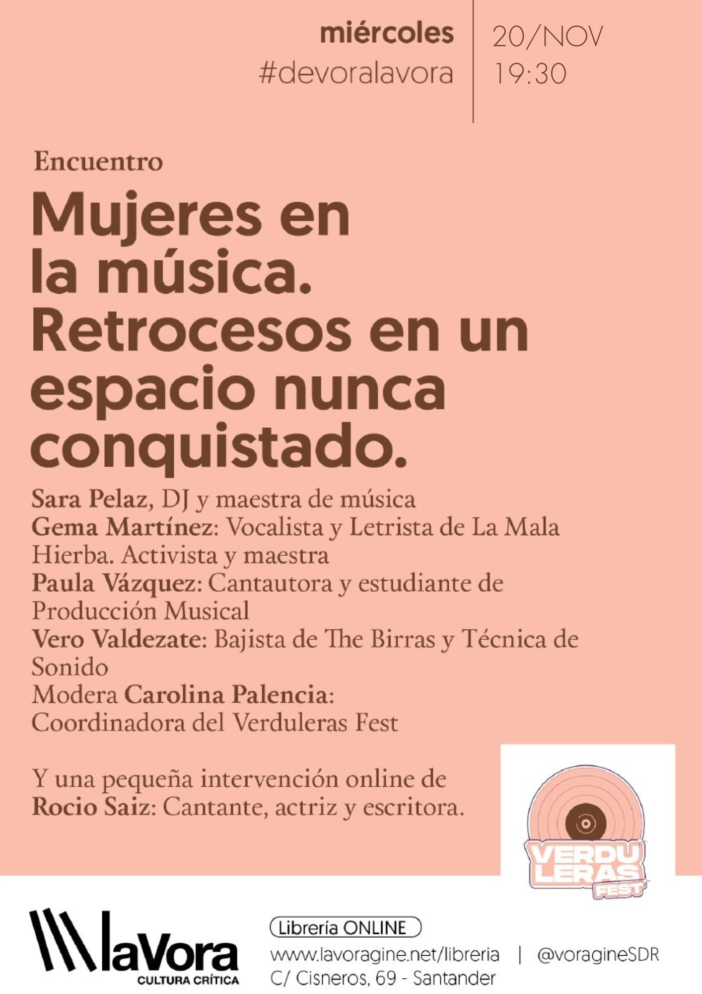 El miércoles 20 de noviembre desde las 17:30, dentro de las actividades que el festival Verduleras Fest tiene programadas en Cantabria, organiza una mesa redonda en la librería La Vorágine, en Santander, para dar visibilidad a “las grandes desigualdades de género que hay en la industria musical”, un problema, según las organizadores “extrapolable a otros ámbitos laborales dentro del mundo de la cultura”.