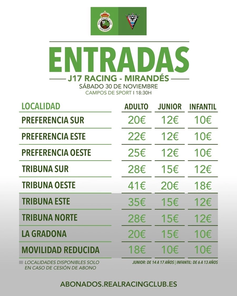 Las entradas, a excepción de las correspondientes a La Gradona, Tribuna Norte, Tribuna Este y Movilidad Reducida (el aforo de estas zonas de El Sardinero ha sido completado íntegramente por abonados), están disponibles para adultos desde 20 euros, en tanto que las destinadas a seguidores infantiles y junior tienen un precio que parte en 10 y 12 euros respectivamente.