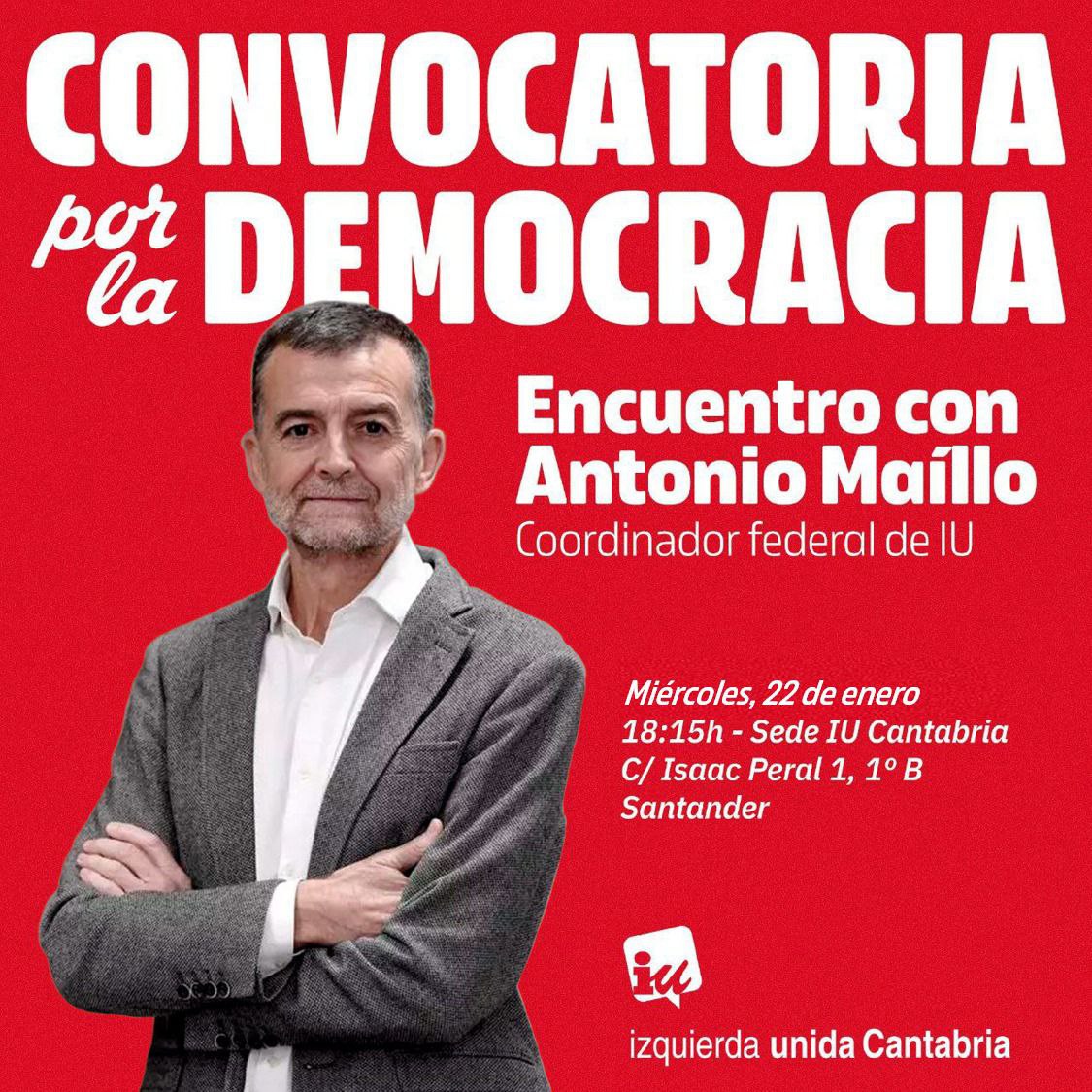 El coordinador federal de Izquierda Unida (IU), Antonio Maíllo, visitará Cantabria este miércoles, 22 de enero, para participar en una jornada de trabajo centrada en temas socio-laborales y en la presentación de la iniciativa ‘Convocatoria por la Democracia’ en la región.