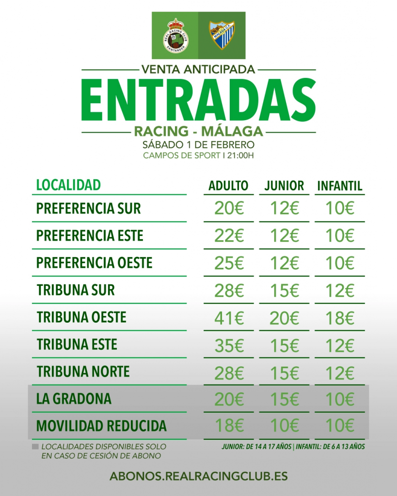 La venta anticipada de entradas para el partido del Racing de Santander contra el Málaga CF, correspondiente a la vigésima quinta jornada de LaLiga Hypermotion, comienza mañana jueves, 23 de enero, a las 10:00 horas y estará exclusivamente disponible para los abonados del club.
