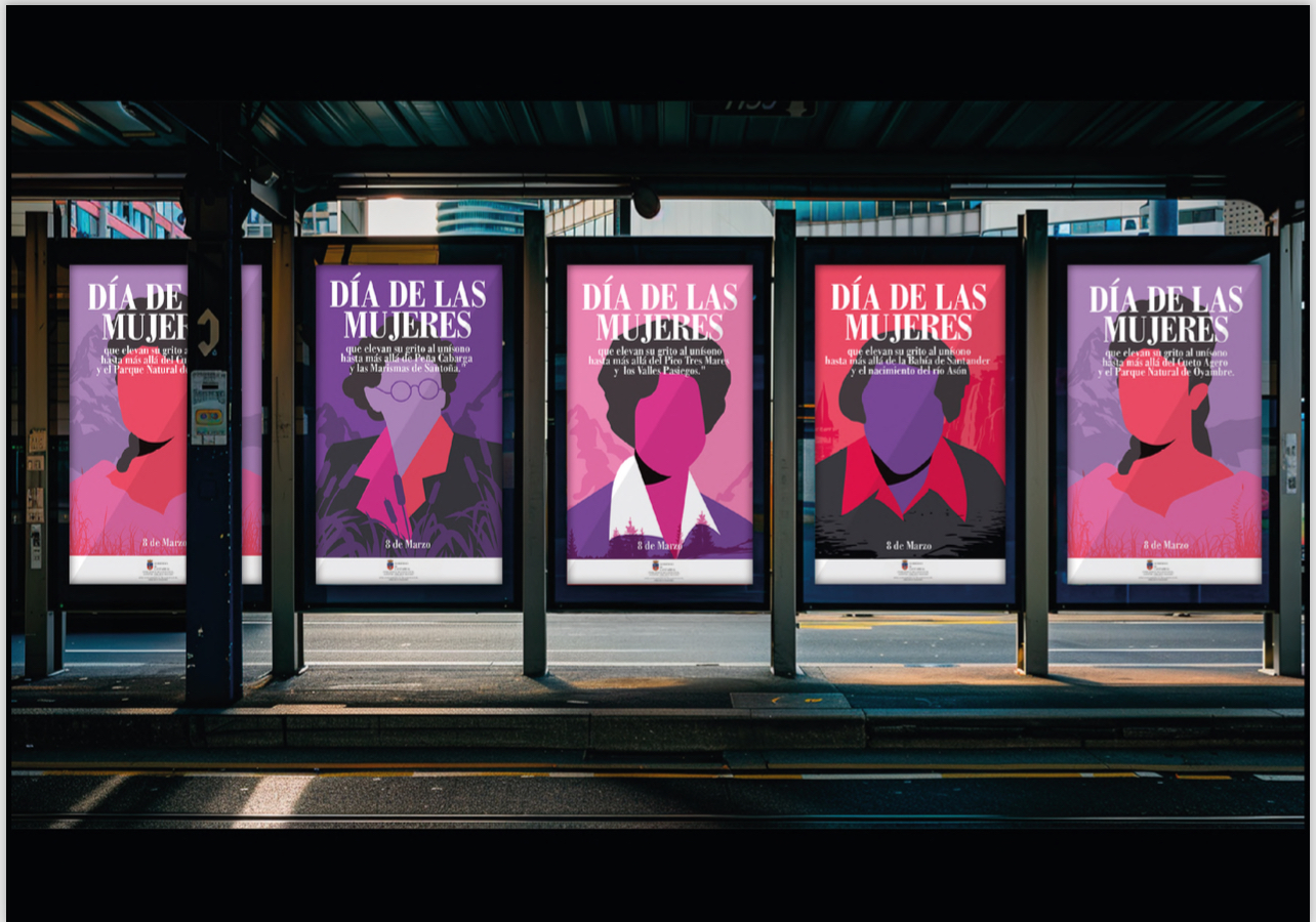 La campaña, bajo el lema “Día de las mujeres que elevan su grito más allá de…”, rinde homenaje a figuras como Matilde Gómez Camus, Consuelo Bergés, Rosario Acuña y Ana María de Cagigal, cuyas vidas y logros trascendieron más allá del tiempo y lugar en el que vivieron. Cada una de ellas aparece reflejada en carteles que fusionan sus imágenes con los más emblemáticos paisajes cántabros: los Picos de Europa, la Bahía de Santander o las Cuevas de Altamira. Estos carteles no solo resaltan su legado, sino que, a través de un diseño modular, logran transmitir un mensaje visual común que apela a la unidad y a la acción colectiva.