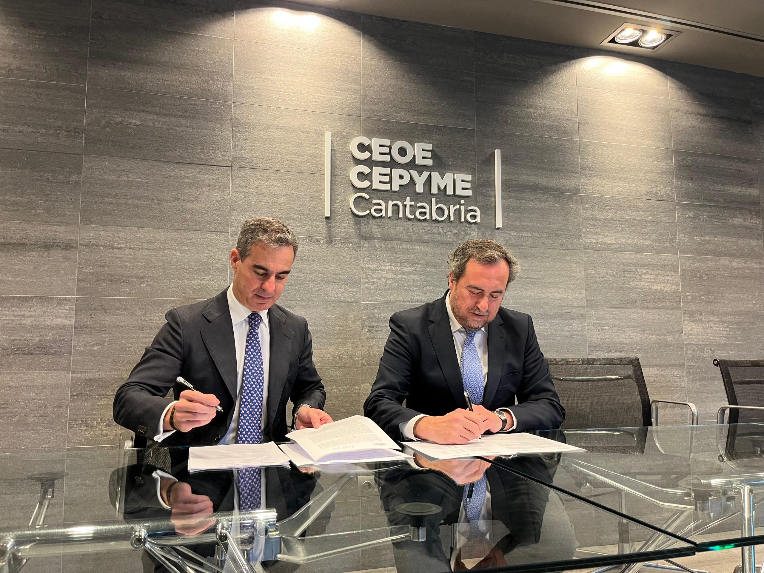 El acto de firma, celebrado en la sede de la patronal cántabra, contó con la participación de Francisco Aguilera, director general de CEOE CEPYME Cantabria, y Emilio Cuadrado, director comercial de Asturias y Cantabria de CaixaBank.
