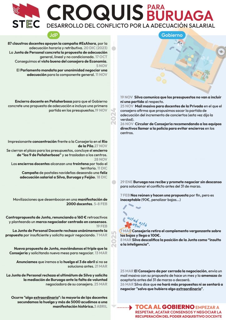 “Ya ha ocurrido algo extraordinario”, subraya STEC, en referencia a la huelga y manifestación masivas, por lo que consideran que ahora son Buruaga y Silva quienes deben responder a la propuesta de la Junta y demostrar si están dispuestos a retomar el diálogo.