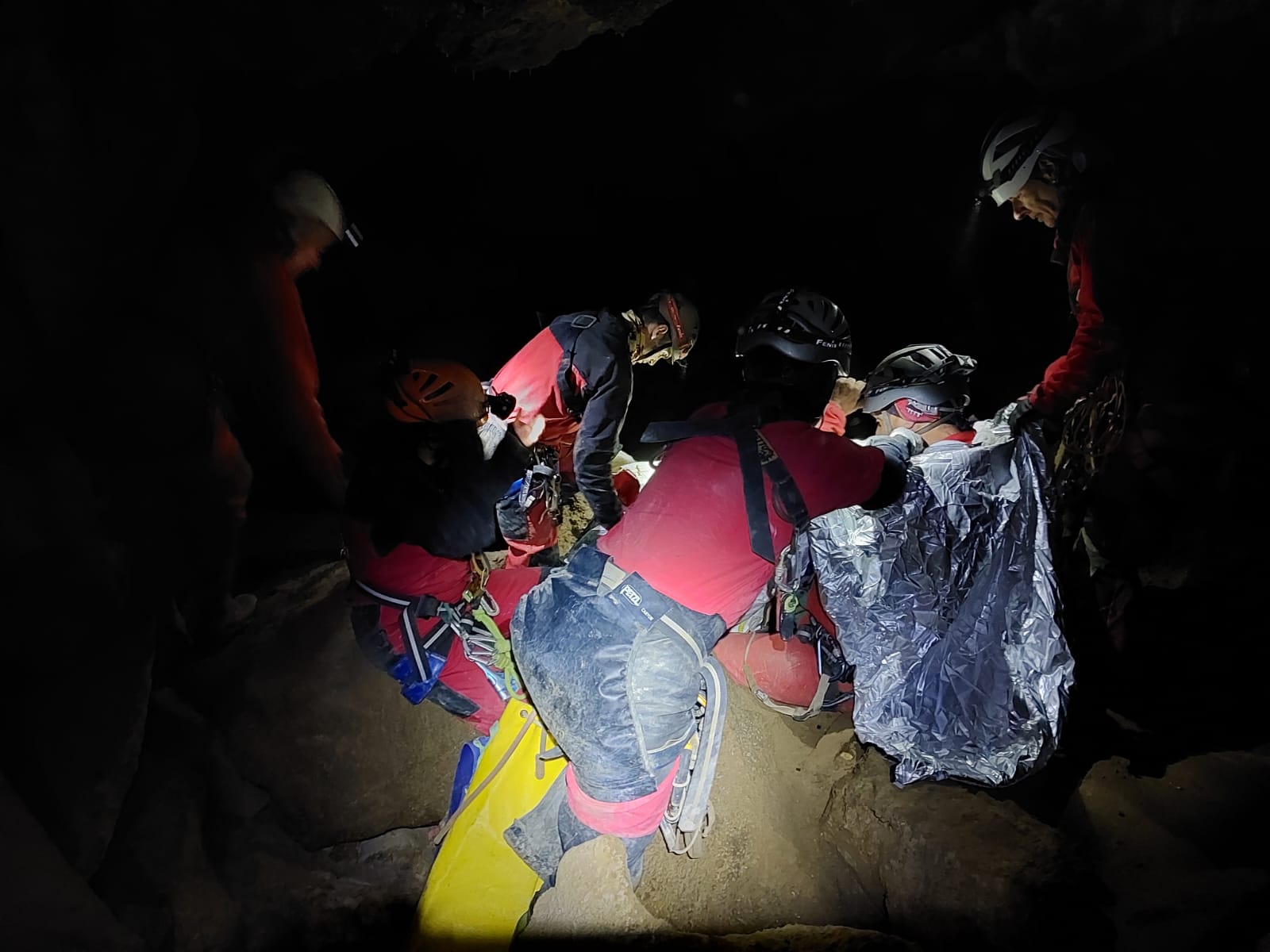 El accidentado presentaba una luxación grave en el hombro derecho que le impedía continuar su progresión vertical por el interior de la cavidad. Gracias a la intervención médica en el propio lugar, se le redujo la luxación, se recolocó el hombro y se le administraron antiinflamatorios. Esto permitió que pudiera colaborar activamente en el rescate, sin necesidad de camilla.