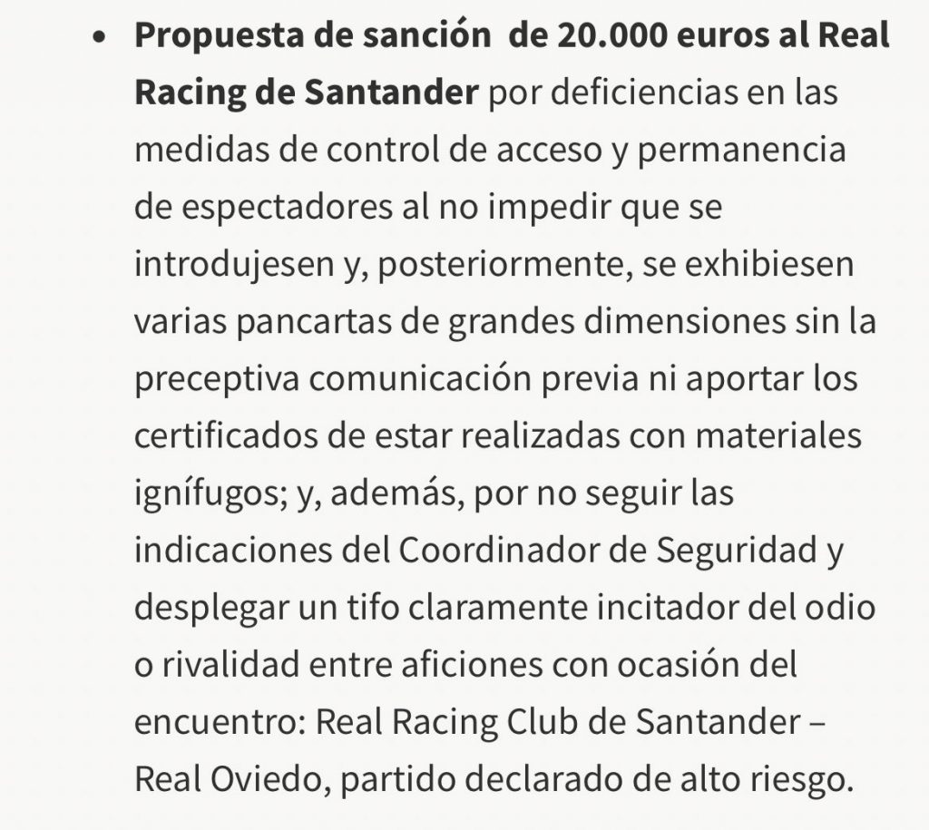 Según ha informado el Consejo Superior de Deportes (CSD), la propuesta de sanción al club verdiblanco se fundamenta en “deficiencias en las medidas de control de acceso y permanencia de espectadores”. Concretamente, el Racing no habría impedido la introducción ni la posterior exhibición de varias pancartas de grandes dimensiones sin la preceptiva autorización previa ni los certificados exigidos que acrediten el uso de materiales ignífugos.