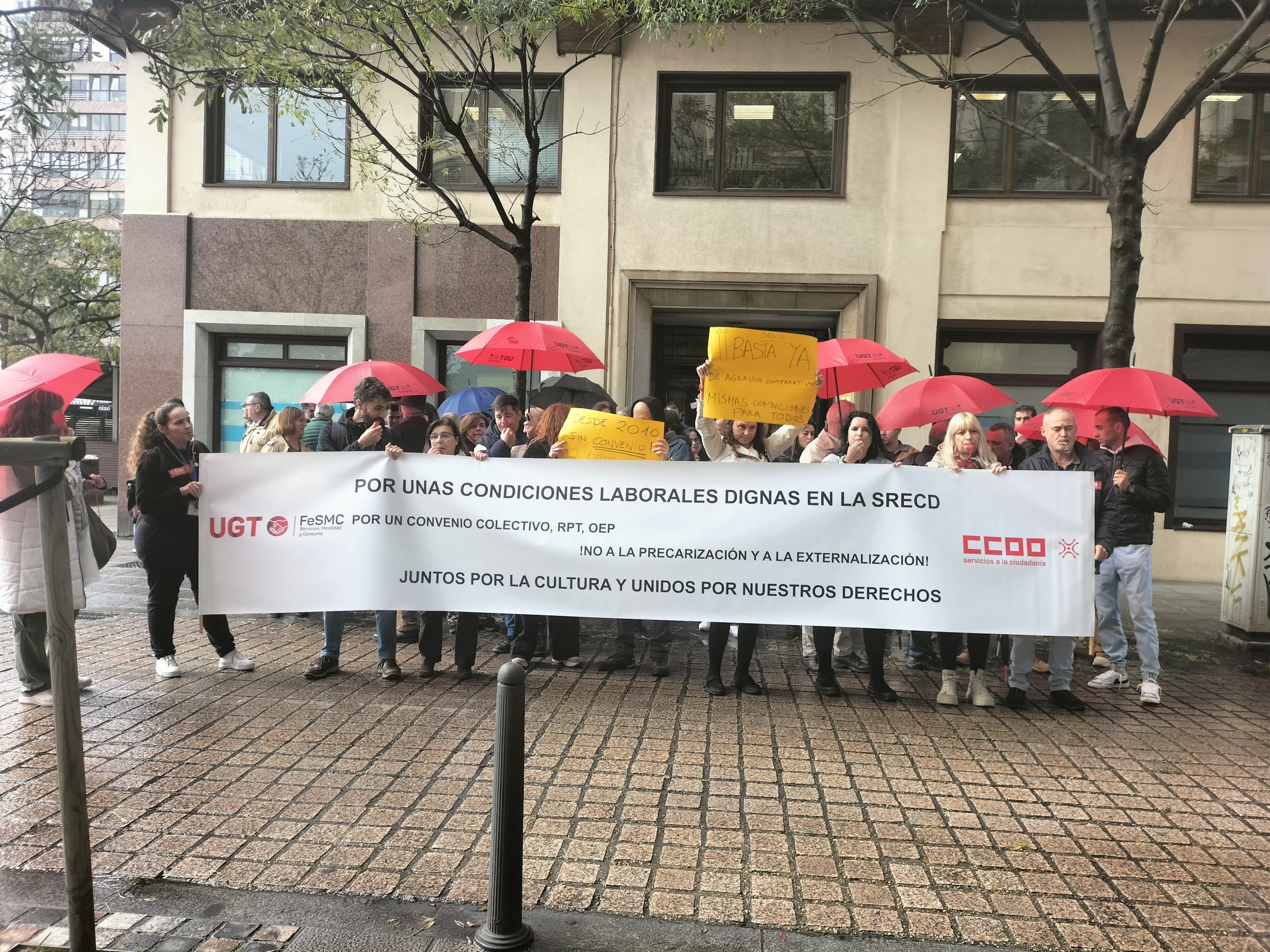 La primera concentración reunió a unos treinta empleados a las puertas de la Consejería de Cultura, Turismo y Deporte, en la calle Lealtad de Santander. Durante el acto, los asistentes protestaron con pitos y portaron una gran pancarta en la que se podía leer: “Por unas condiciones laborales dignas en la SRECD” y “Juntos por la Cultura y unidos por nuestros derechos”.