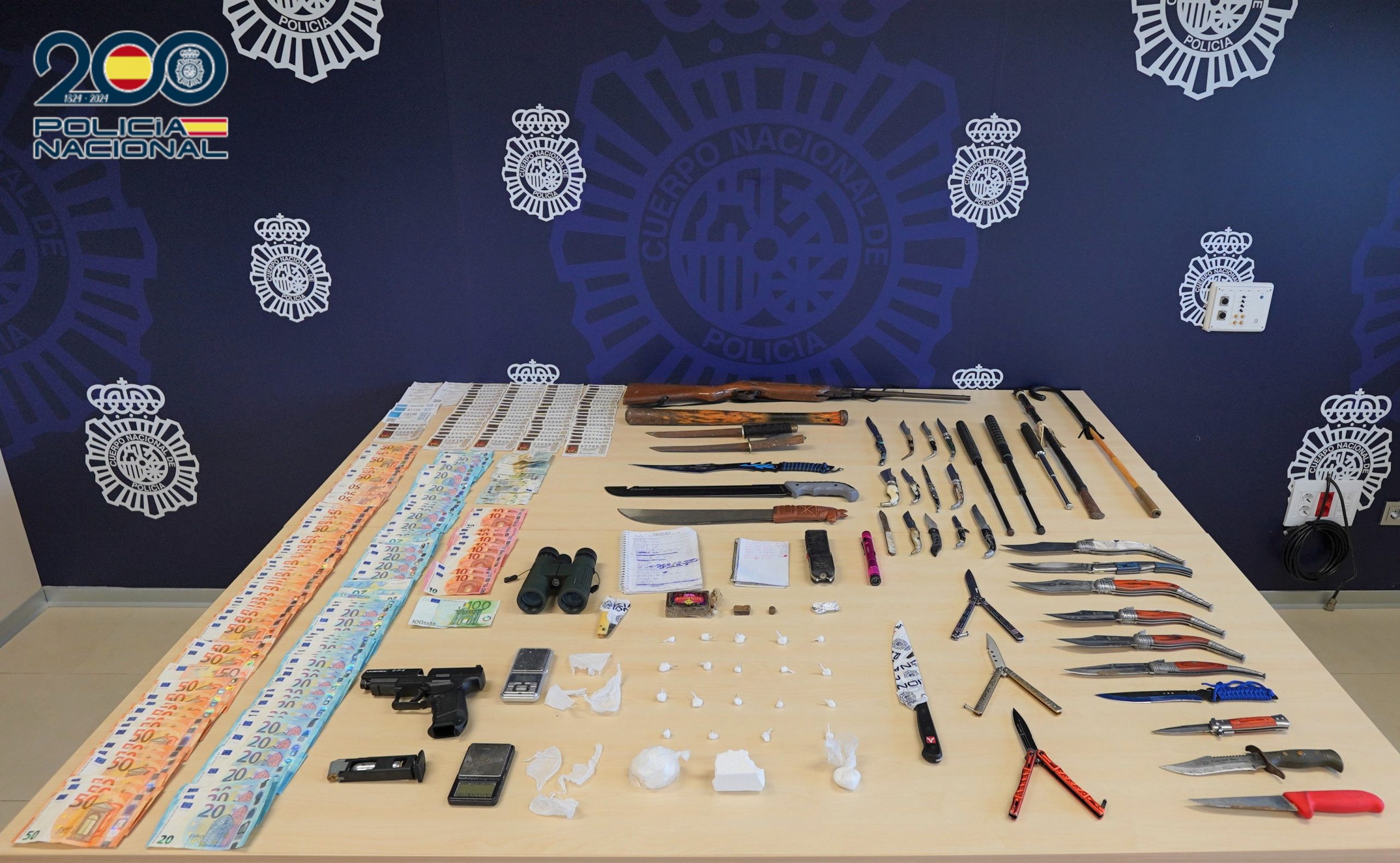 Esa operación culminó en la madrugada del día 12 de noviembre, cuando agentes especializados, junto al equipo GOES desplazado desde el País Vasco, irrumpieron en la vivienda ejecutando la diligencia con rapidez y máxima seguridad. Durante el registro, no solo dejaron constancia de la actividad de venta al menudeo, sino que incautaron pruebas contundentes: cerca de 96 gramos de hachís, algo más de 150 gramos de cocaína, armas de aire comprimido, machetes, defensas extensibles, varias navajas y unos 6.000 euros en efectivo, además de útiles para el corte y distribución de las sustancias.