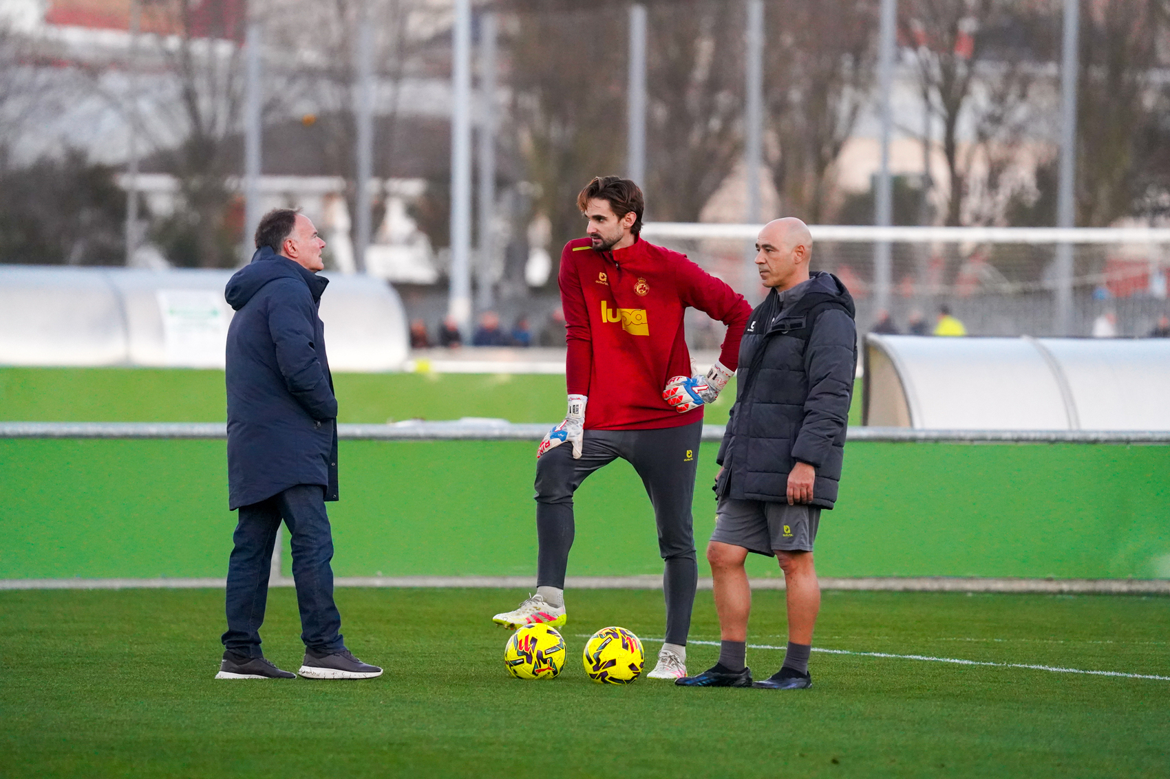 La sesión, programada para las 17:00 horas, dejó una noticia especialmente positiva: la presencia sobre el césped de Jokin Ezkieta. El guardameta navarro, que sufrió una lesión muscular en el hombro derecho en el encuentro ante el Cádiz en el Nuevo Mirandilla, ha dado un paso adelante en su recuperación y ya trabaja con balón junto al readaptador Hugo Camarero. Hace apenas una semana aún utilizaba cabestrillo y ahora se lanza al suelo y completa ejercicios específicos con aparente normalidad, lo que alimenta el optimismo en el club sobre sus plazos de regreso
