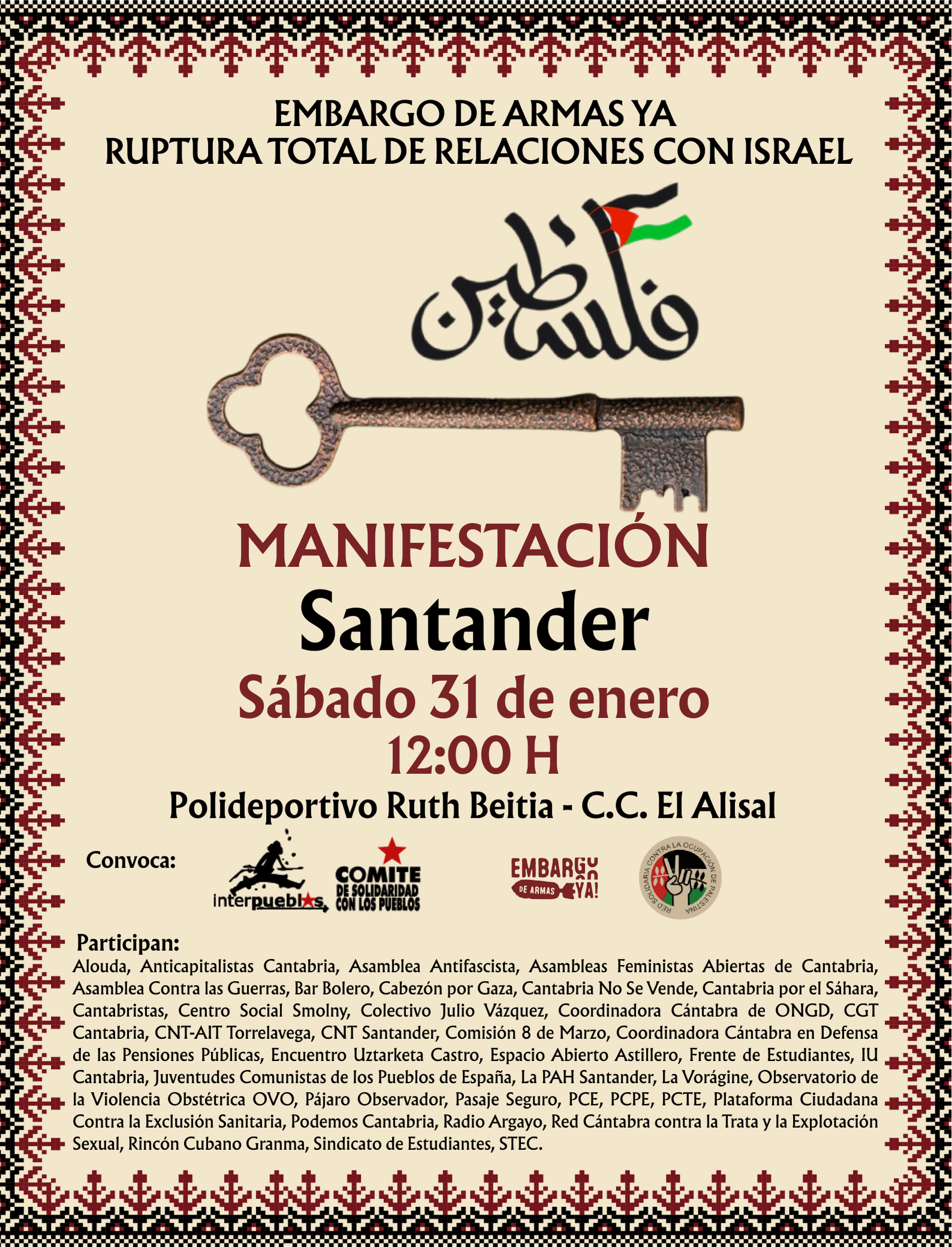 El Comité de Solidaridad con los Pueblos–Interpueblos volverá a salir este sábado, 31 de enero, a las calles de Santander para expresar su apoyo al pueblo palestino y reclamar al Gobierno español la aplicación de un embargo integral de armas y la ruptura completa de relaciones diplomáticas con Israel. La convocatoria cuenta con el respaldo de alrededor de cuarenta organizaciones sociales, políticas y sindicales de Cantabria que se suman al llamamiento promovido a nivel estatal por la Red de Solidaridad contra la Ocupación y la Colonización de Palestina (RESCOP).